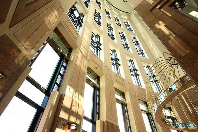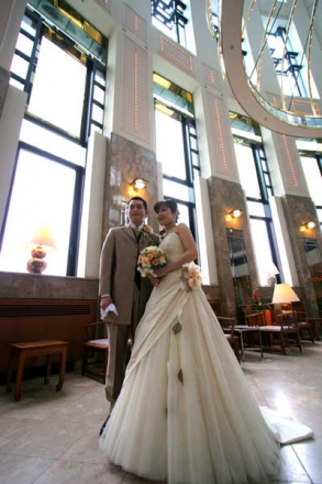 最上11階までの吹き抜けになった、開放感のある大理石のロビーアトリウムでのウェディング。 まるでヨーロッパの教会のように一面の窓から降り注ぐ陽光が、お二人を温かく祝福します。 可能な挙式スタイル…教会式、人前式